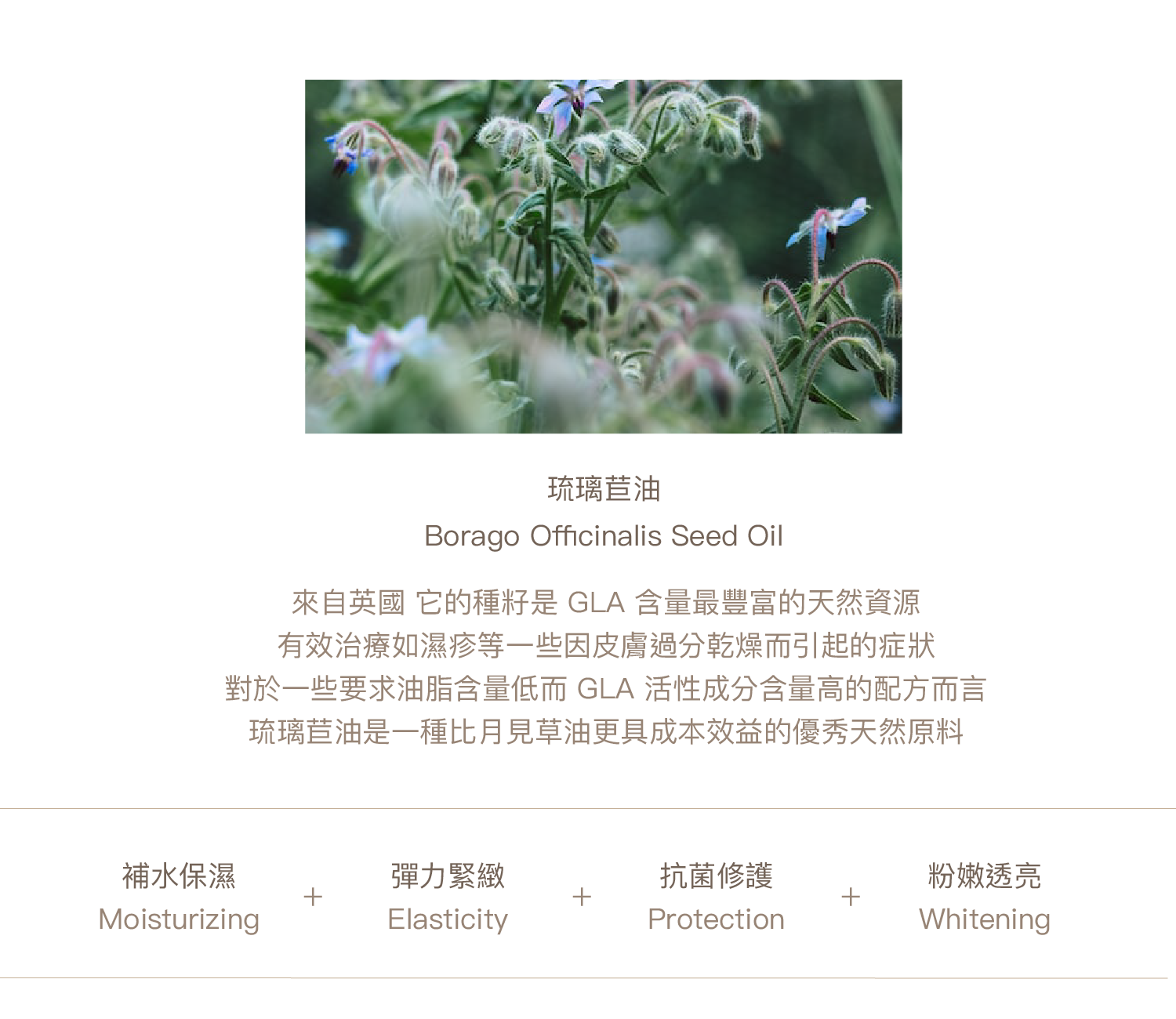 - 保濕:所有成份均有保濕滋潤成效